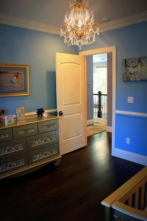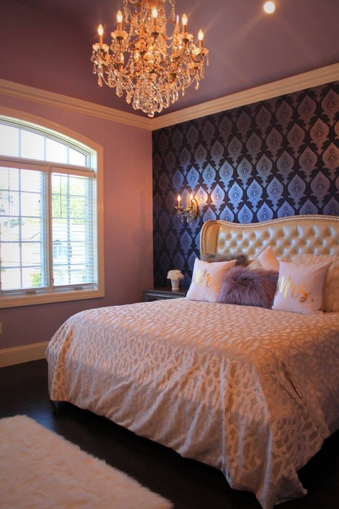 Cathedral ceilings in the family room create an open concept feel, which flows into the adjoining kitchen- a chef’s delight. Striking a balance between modern and traditional, the elegant dark and light cabinetry is complimented by stone Corzit countertops and a cool grey tiled backsplash. Sleek appliances are all stainless steel, while chandeliers add a touch of opulence.