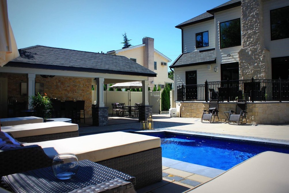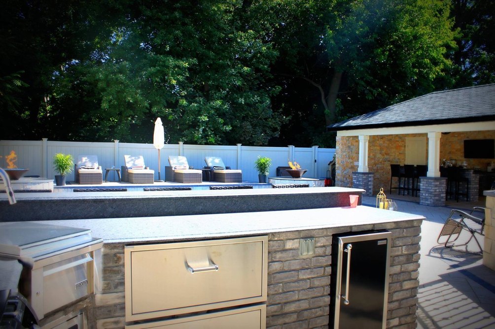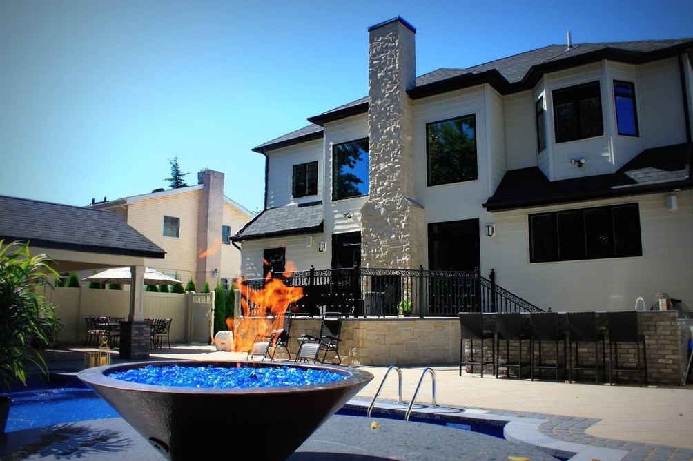 Accessible through sliding doors is the fully paved backyard with outdoor kitchen, full wet bar, outdoor bath and lagoon-like pool complete with waterfalls and copper fire balls. Virtually zero maintenance is required for this fully paved patio, leaving more time to luxuriate here all year round- an outdoor fireplace keeps the party going during winter months.